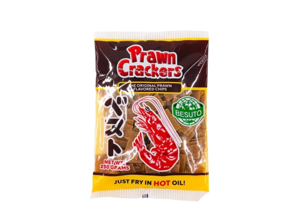 Besuto Uncooked Prawn Crackers (Original) are thin, pale, dehydrated discs made from tapioca/starch and prawn flavoring. Sold raw and hard, they expand into light, airy, crispy snacks when deep-fried or microwaved. Flavor: savory, mildly seafood-forward prawn taste with subtle saltiness. Texture after cooking: crunchy, brittle, melt-in-mouth chips. Common uses: snack on their own, serve with dips or as an appetizer; popular at parties and with meals. Preparation: deep-fry a few seconds in hot oil (around 180°C/350°F) until puffed—drain excess oil.