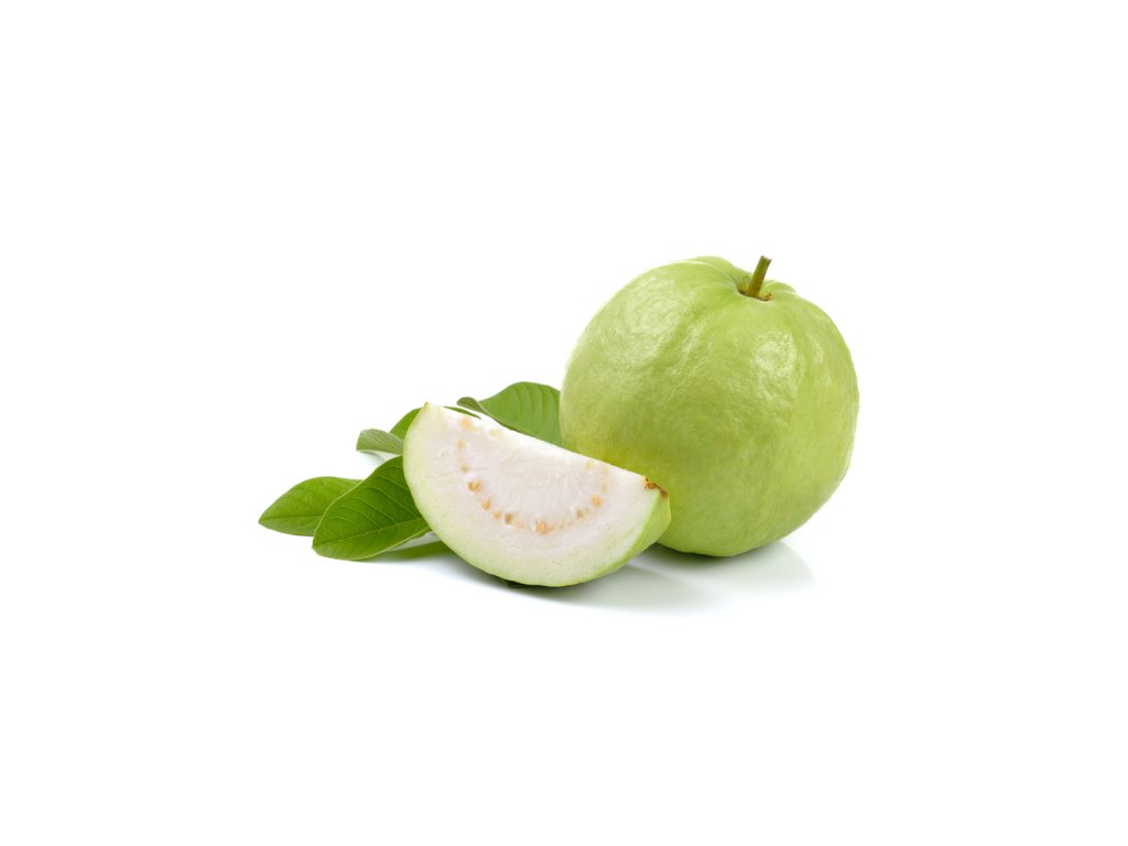 Green medium guava a round to slightly pear-shaped tropical fruit, with smooth bright-to-dull green skin that may stay green when ripe. Interior: crisp to slightly grainy white flesh surrounding numerous small, edible pale seeds. Flavor: fragrant, mildly sweet with floral and tangy notes when ripe; more tart and astringent if underripe. Texture: firm-crisp when just ripe, softening as it becomes fully ripe. Uses: eaten fresh, sliced into salads. Nutrition: high in vitamin C, good fiber source, potassium, and antioxidants. Storage: let underripe fruit ripen at room temperature; refrigerate ripe guavas and use within several days.