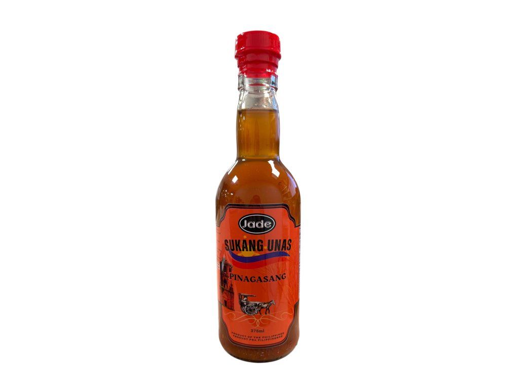 Jade Sukang Unas Pinagasang Sugarcane Vinegar — a clear, mildly amber vinegar made from fermented sugarcane (sukang unas) with a gentle, rounded acidity and subtle sweet undertones. The aroma is clean and slightly vinous rather than sharp, offering a softer sourness compared with stronger white or cane vinegars. Flavor profile lends a pleasant balance of tang and faint caramel-like sweetness, making it versatile for dipping sauces, marinades, pickling, and as a finishing splash for salads or cooked vegetables. Packaged for pantry stability and everyday Filipino-style cooking, it complements dishes that benefit from a milder, slightly sweet vinegar character.
