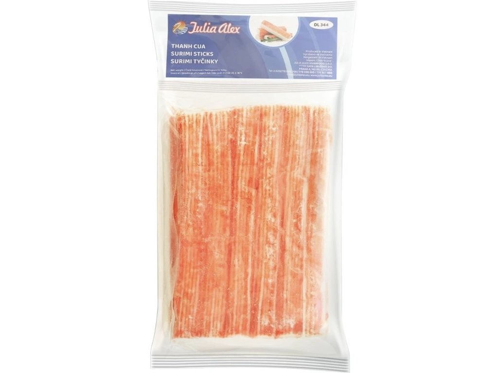 Surimi or Crab Sticks are processed seafood products made from white fish, such as pollock or cod, that are minced, pressed into a paste, and then shaped to mimic the appearance and texture of crab meat. They are typically coated with a thin layer of red or pink coloring on the outside to resemble crab legs or shells. Surimi is often seasoned and flavored to imitate the taste of crab. It is commonly used in sushi, salads, seafood platters, or as an ingredient in various cooked dishes. Surimi or crab sticks are convenient, versatile, and popular as a seafood alternative in many cuisines.