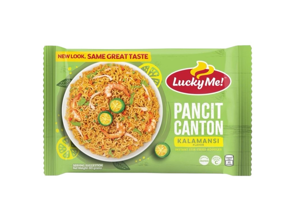 Lucky Me! Pancit Canton Kalamansi — instant stir-fry noodles with a bright kalamansi citrus tang. Springy, wavy noodles coated in a savory, slightly tangy sauce with garlic and seasoning oil, delivering a refreshing, zesty twist on classic pancit. Ready in minutes; enjoy as a quick meal or snack.