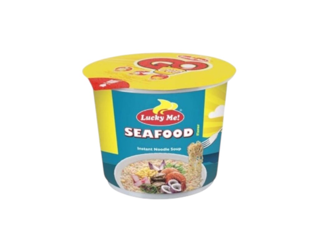 Lucky Me! Seafood Instant Noodle Soup — Quick, savory seafood-flavored instant noodles with springy wheat noodles and pre-measured umami seasoning; ready in minutes, great with added egg or veggies.