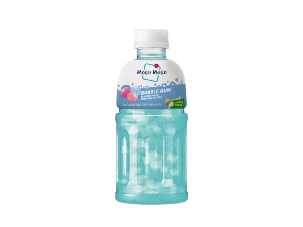 Mogu Mogu Bubble Gum Drink with Nata de Coco — sweet bubble-gum flavored beverage with chewy nata de coco pieces for a fun, refreshing texture contrast.
