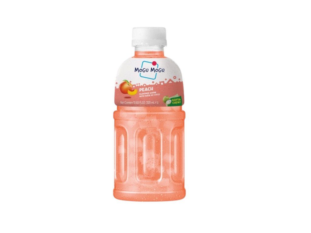 Mogu Mogu Peach is a sweet, lightly fizzy (non-carbonated) Asian fruit drink featuring peach-flavored juice and soft, chewy nata de coco cubes suspended throughout. The flavor is bright, fruity, and pleasantly sweet with a subtle tang; the nata de coco adds a refreshing, jelly-like chew that differentiates it from ordinary fruit drinks.
