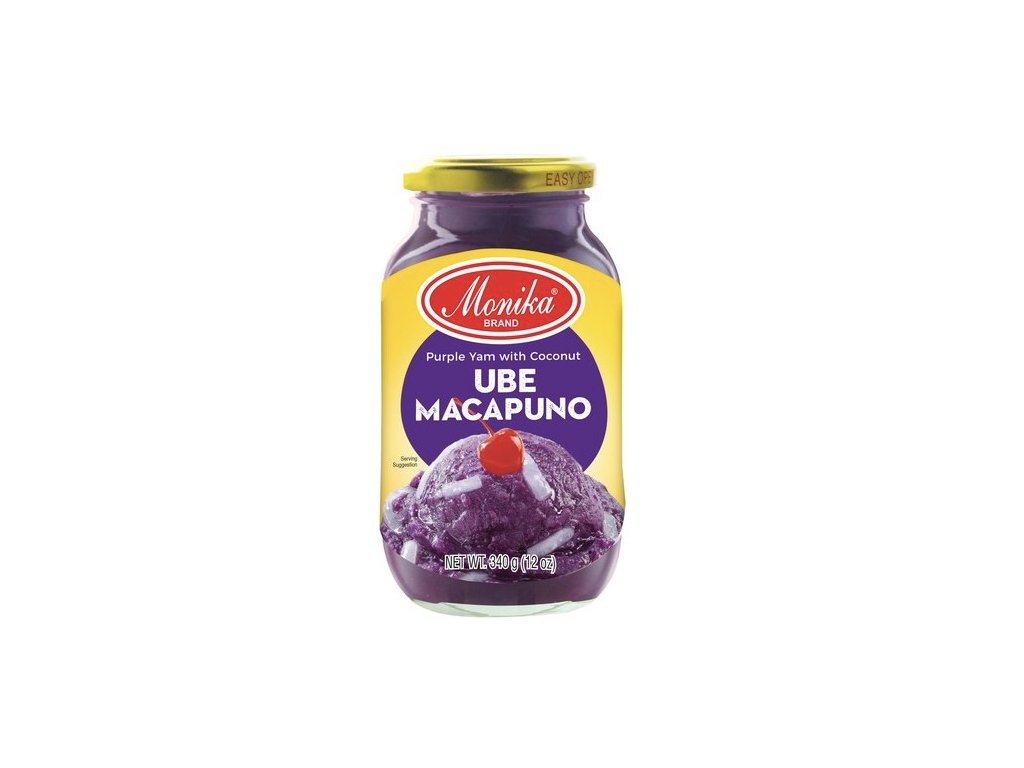 Monika Purple Yam Fruit Spread (Ube Jam) 340 g is a creamy and sweet spread made from finely pureed purple yam, known for its vibrant color and rich flavor. This delightful jam is perfect for spreading on toast, pancakes, or waffles, and can also be used as a filling for desserts and pastries. Its unique taste and texture make it a delicious addition to both breakfast and snack options, offering a taste of traditional Filipino sweetness in every bite.