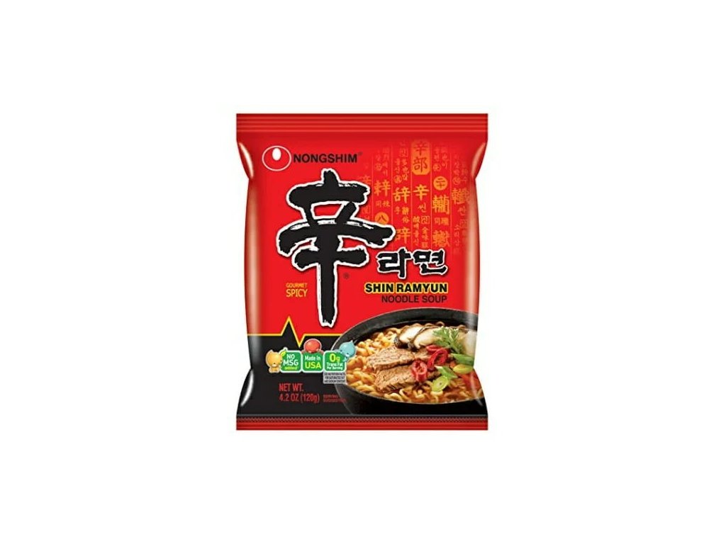 Nongshim Shin Ramyun Spicy is a popular instant noodle soup known for its bold and fiery flavor. It features chewy, wavy noodles in a rich, spicy broth made with chili, garlic, and a blend of savory seasonings. Perfectly balanced between heat and flavor, this dish delivers a satisfying and warming experience, making it a favorite for those who enjoy a spicy and flavorful meal. Quick to prepare, Shin Ramyun Spicy offers a delicious taste of Korean cuisine with each bowl.