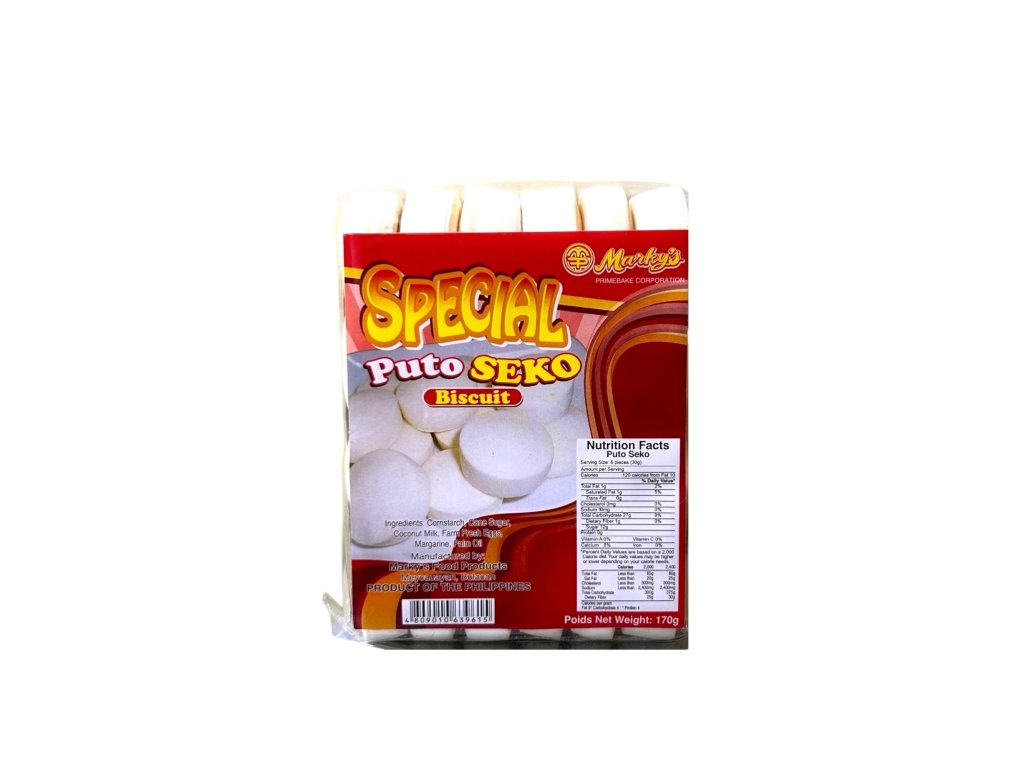 Marky’s Puto Seko Biscuit is a popular Filipino snack characterized by its light, airy texture and sweet flavor. This biscuit is often enjoyed with coffee or tea. It typically has a subtle sweetness, with a hint of coconut flavor that complements its dry, crumbly texture. Puto Seko is known for its distinctive appearance, usually shaped in small rounds or squares, and is often dusted with a light coating of sugar. It’s a nostalgic treat for many Filipinos, commonly served during special occasions or as an everyday snack.