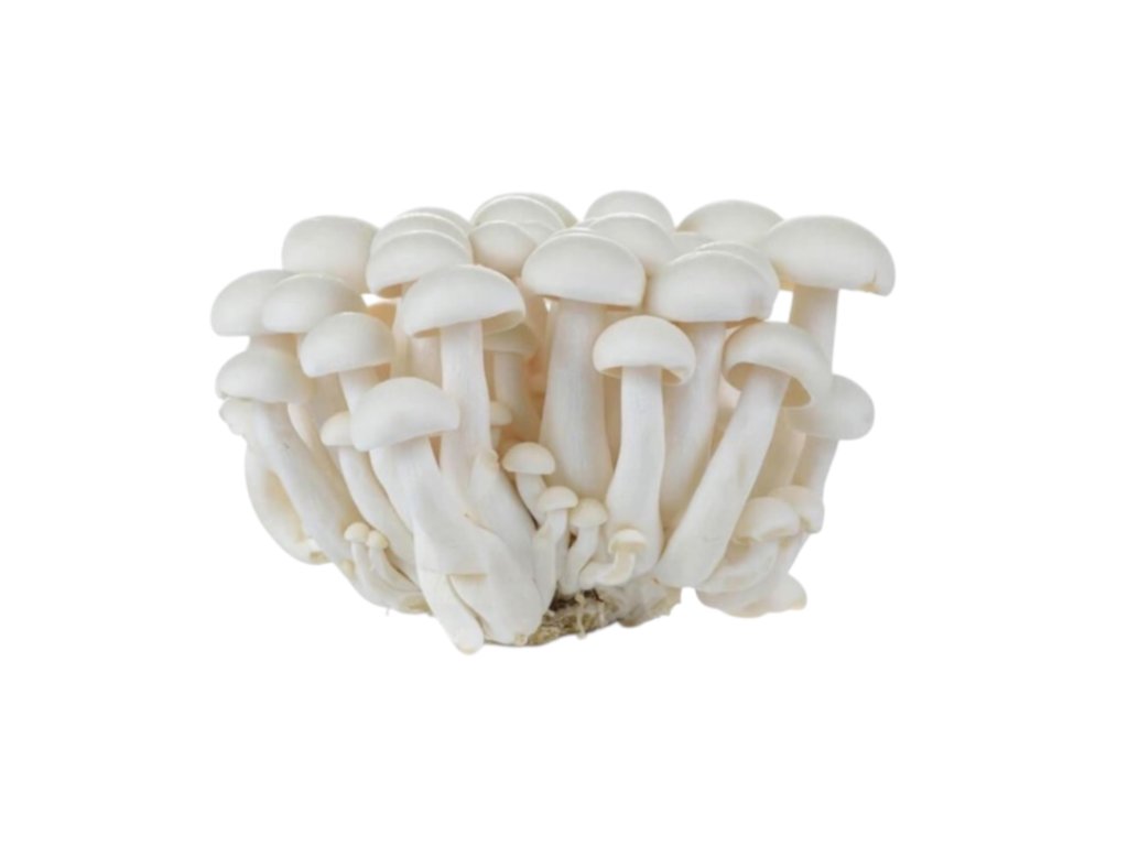 White shimeji (Hypsizygus tessellatus) is a cluster-forming edible mushroom with creamy, slender stems and small rounded caps, firm-crisp texture, and a mild bitterness raw that becomes nutty, umami-rich when cooked. Common in Asian cooking—stir-fries, soups, hot pots—it's low-calorie, provides B vitamins and minerals, and should be refrigerated and used within about a week.